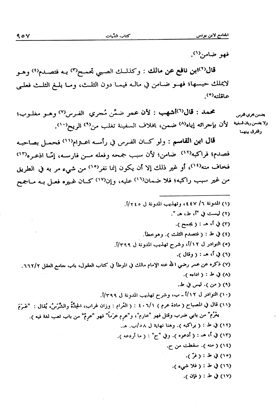 قال ابن القاسم: ولو كان الفرس في رأسه اعترام فحمل بصاحبه فصدم؛ فراكبه ضامن؛ لأن سبب جمحه وفعله من فارسه، إما أذعره فخاف منه، أو غير ذلك إلا أن يكون إنما نفر من شيء مر به في الطريق من غير سبب راكبه؛ فلا ضمان عليه، وإن كان غيره فعل به ما جمح