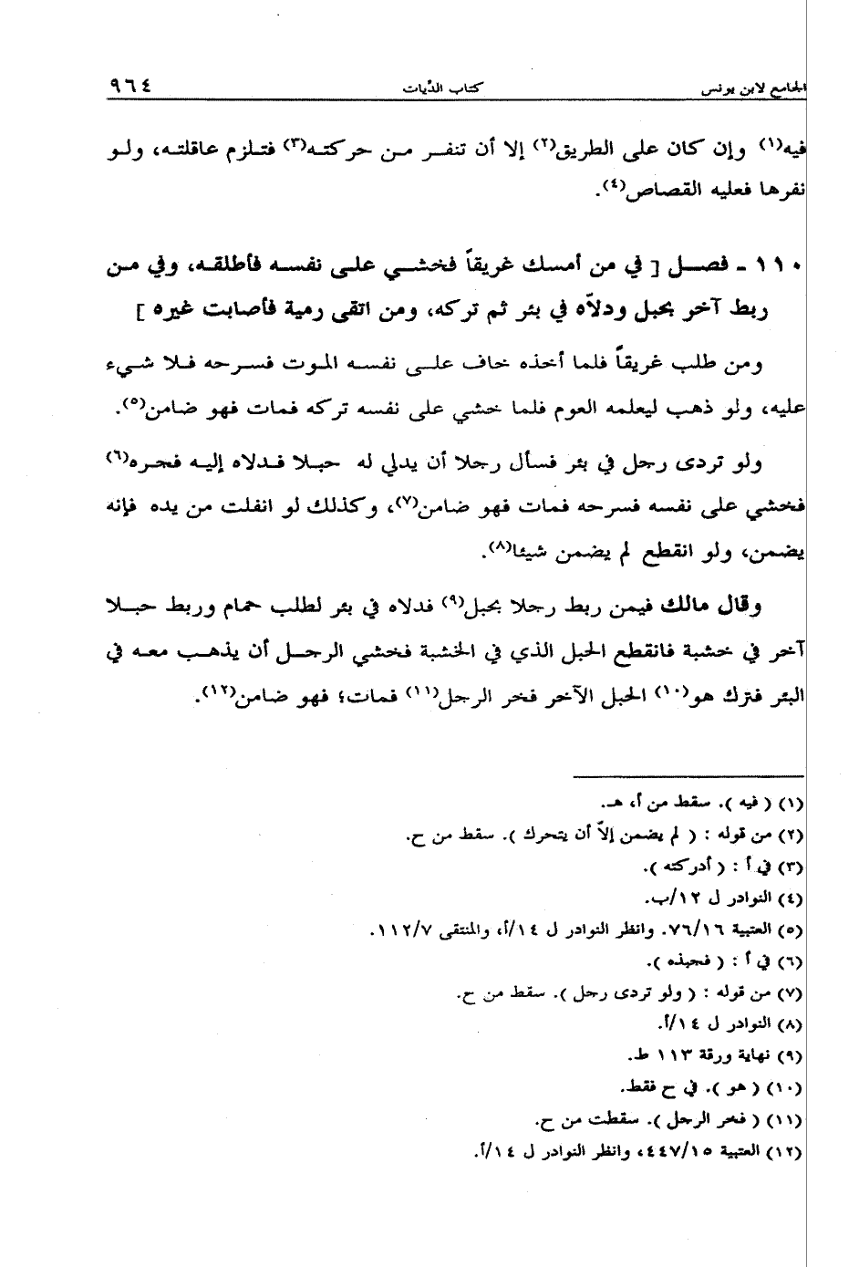 110 - فصل [في من أمسك غريقاً فخشي على نفسه فأطلقه، وفي من ربط آخر بحبل ودلاه في بئر ثم تركه، ومن اتقى رمية فأصابت غيره]