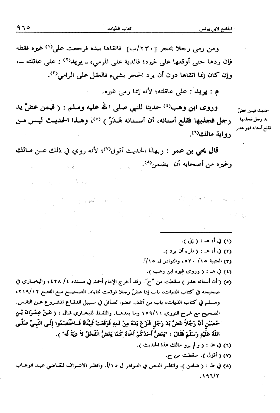 وروى ابن وهب حديثا للنبي صلى الله عليه وسلم: (فيمن عض يد رجل فجذبها فقلع أسنانه، أن أسنانه هدرٌ)، وهذا الحديث ليس من رواية مالك.