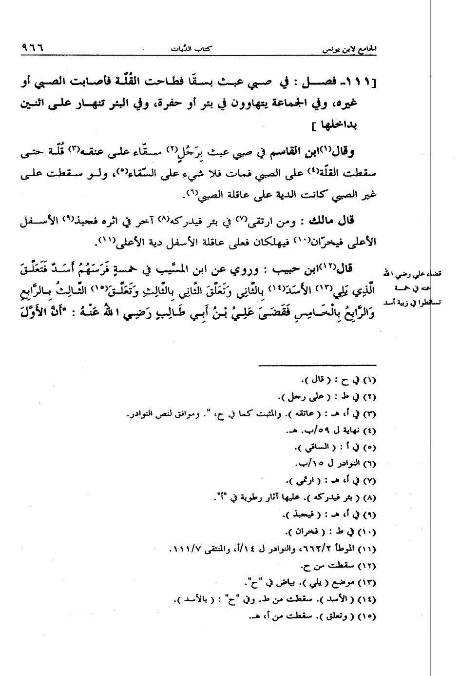 قال ابن حبيب: وروي عن ابن المسيب في خمسة فسهم أسد فتعلق الذي يلي الأسد بالثاني وتعلق الثاني بالثالث وتعلق الثالث بالرابع والرابع بالخامس فقضي علي بن أبي طالب رضي الله عنه: "أن الأول