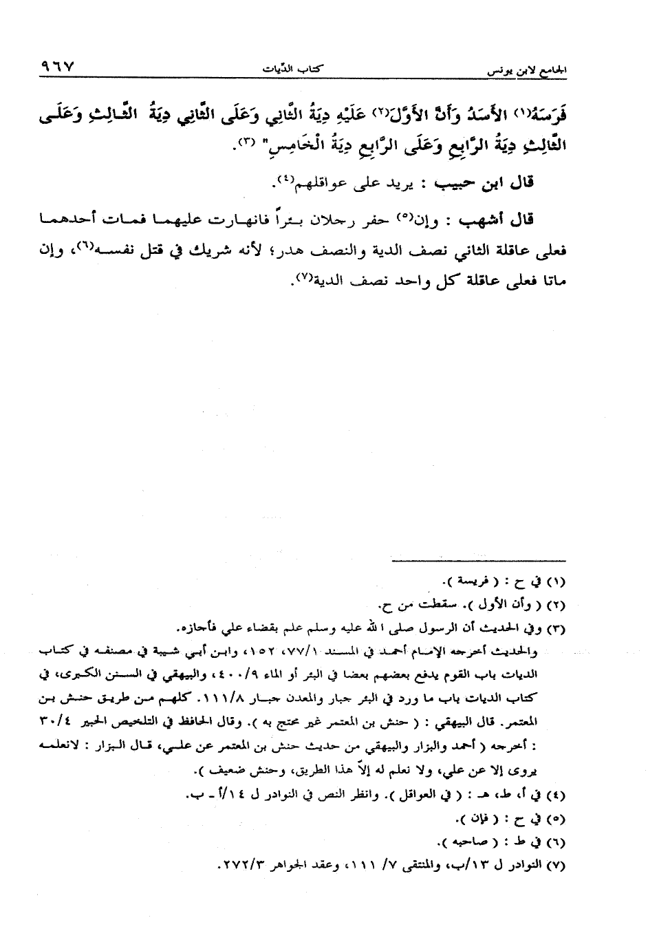 فرسه الأسد وأن الأول عليه دية الثاني وعلى الثاني دية الثالث وعلى الثالث دية الرابع وعلى الرابع دية الخامس".