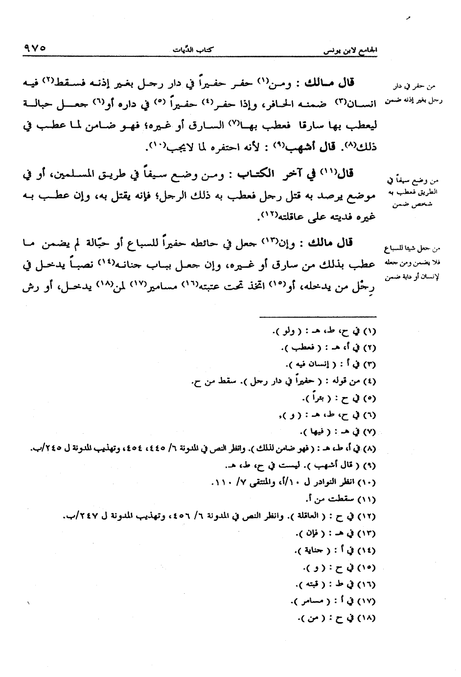 قال مالك: ومن حفر حفيراً في دار رجل بغير إذنه فسقط فيه إنسان ضمنه الحافر، وإذا حفر حفيراً في داره أو جعل حبالة ليعطب بها سارقا فعطب بها السارق أو غيره؛ فهو ضامن لما عطب في ذلك. قال أشهب: لأنه احتفره لما لا يجب.