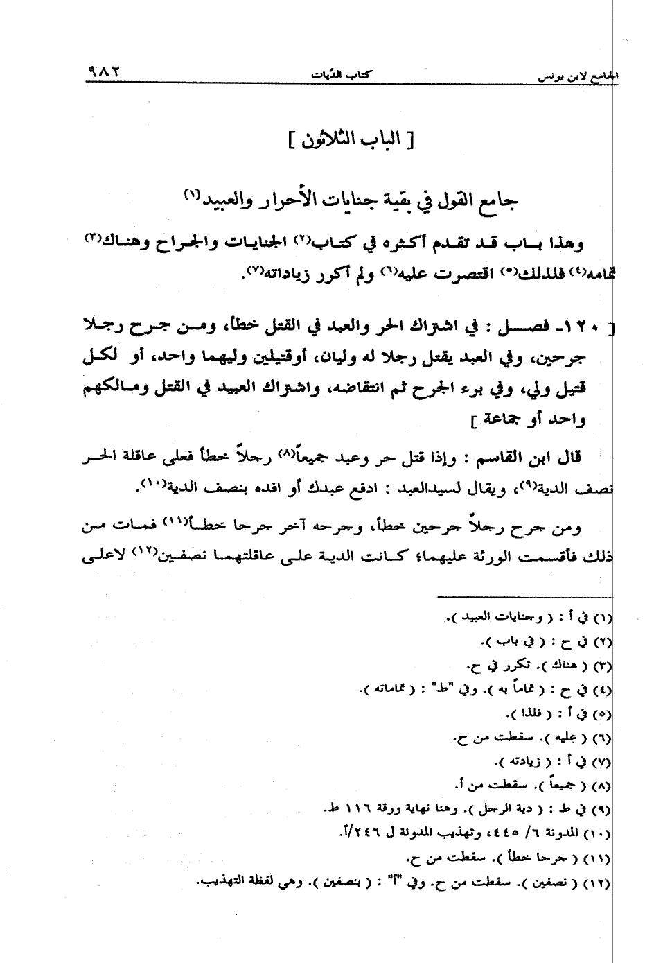[120 - فصل: في اشتراك الحر والعبد في القتل خطأ، ومن جرح رجلا جرحين، وفي العبد يقتل رجلا له وليان، أو قتيلين وليهما واحد، أو لكل قتيل ولي، وفي برء الجرح ثم انتقاضه، واشتراك العبيد في القتل ومالكهم واحد أو جماعة]