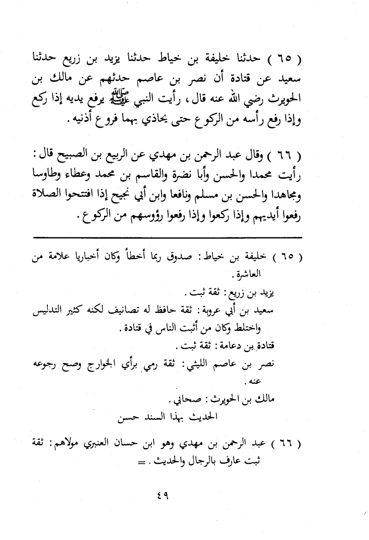 65 - حَدَّثَنَا خَلِيفَةُ بْنُ خَيَّاطٍ , حَدَّثَنَا يَزِيدُ بْنُ زُرَيْعٍ , حَدَّثَنَا سَعِيدٌ , عَنْ قَتَادَةَ أَنَّ نَصْرَ بْنَ عَاصِمٍ , حَدَّثَهُمْ عَنْ مَالِكِ بْنِ الْحُوَيْرِثِ قَالَ: رَأَيْتُ النَّبِيَّ صَلَّى اللهُ عَلَيْهِ وَسَلَّمَ «§يَرْفَعُ يَدَيْهِ إِذَا رَكَعَ , وَإِذَا رَفَعَ رَأْسَهُ مِنَ الرُّكُوعِ حَتَّى يُحَاذِيَ بِهِمَا فُرُوعَ أُذُنَيْهِ»