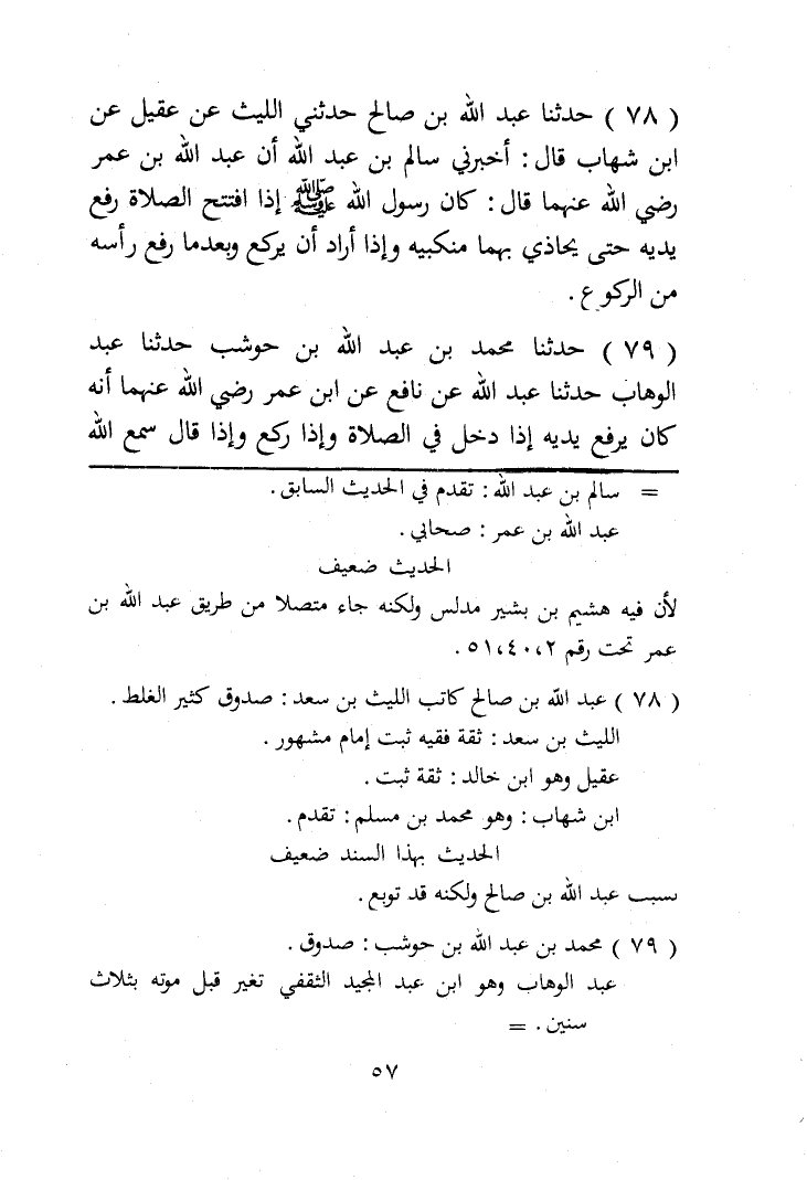 78 - حَدَّثَنَا عَبْدُ اللَّهِ بْنُ صَالِحٍ , حَدَّثَنِي اللَّيْثُ , حَدَّثَنَا عَقِيلٍ , عَنِ ابْنِ شِهَابٍ , قَالَ أَخْبَرَنِي سَالِمُ بْنُ عَبْدِ اللَّهِ أَنَّ عَبْدَ اللَّهِ بْنَ عُمَرَ قَالَ: " كَانَ رَسُولُ اللَّهِ صَلَّى اللهُ عَلَيْهِ وَسَلَّمَ: §إِذَا افْتَتَحَ الصَّلَاةَ يَرْفَعُ يَدَيْهِ حَتَّى يُحَاذِيَ بِهِمَا مَنْكِبَيْهِ , وَإِذَا أَرَادَ أَنْ يَرْكَعَ , وَبَعْدَمَا يَرْفَعُ رَأْسَهُ مِنَ الرُّكُوعِ "