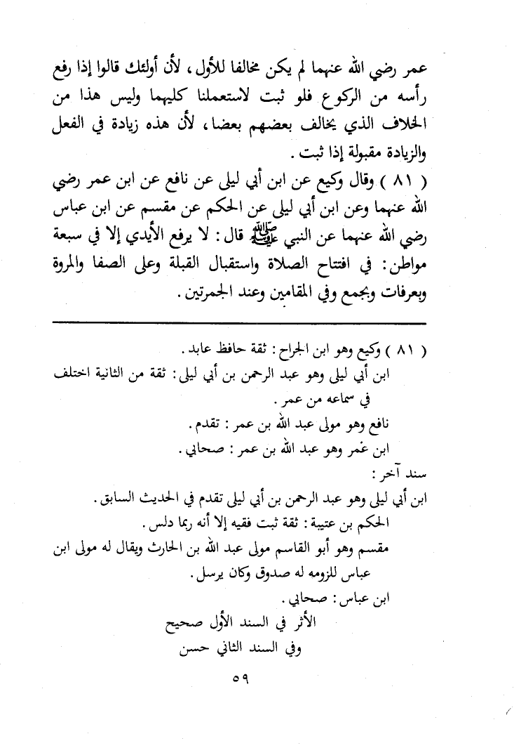 81 - وَقَالَ وَكِيعٌ عَنِ ابْنِ أَبِي لَيْلَى , عَنْ نَافِعٍ , عَنِ ابْنِ عُمَرَ , وَعَنِ ابْنِ أَبِي لَيْلَى , عَنِ الْحَكَمِ , عَنْ مِقْسَمٍ , عَنِ ابْنِ عَبَّاسٍ , عَنِ النَّبِيِّ صَلَّى اللهُ عَلَيْهِ وَسَلَّمَ قَالَ: «§لَا تُرْفَعُ الْأَيْدِي إِلَّا فِي سَبْعَةِ مَوَاطِنَ فِي افْتِتَاحِ الصَّلَاةِ , وَاسْتِقْبَالِ الْكَعْبَةِ , وَعَلَى الصَّفَا وَالْمَرْوَةِ , وَبِعَرَفَاتٍ , وَبِجَمْعٍ وَفِي الْمَقَامَيْنِ وَعِنْدَ الْجَمْرَتَيْنِ» -[60]-