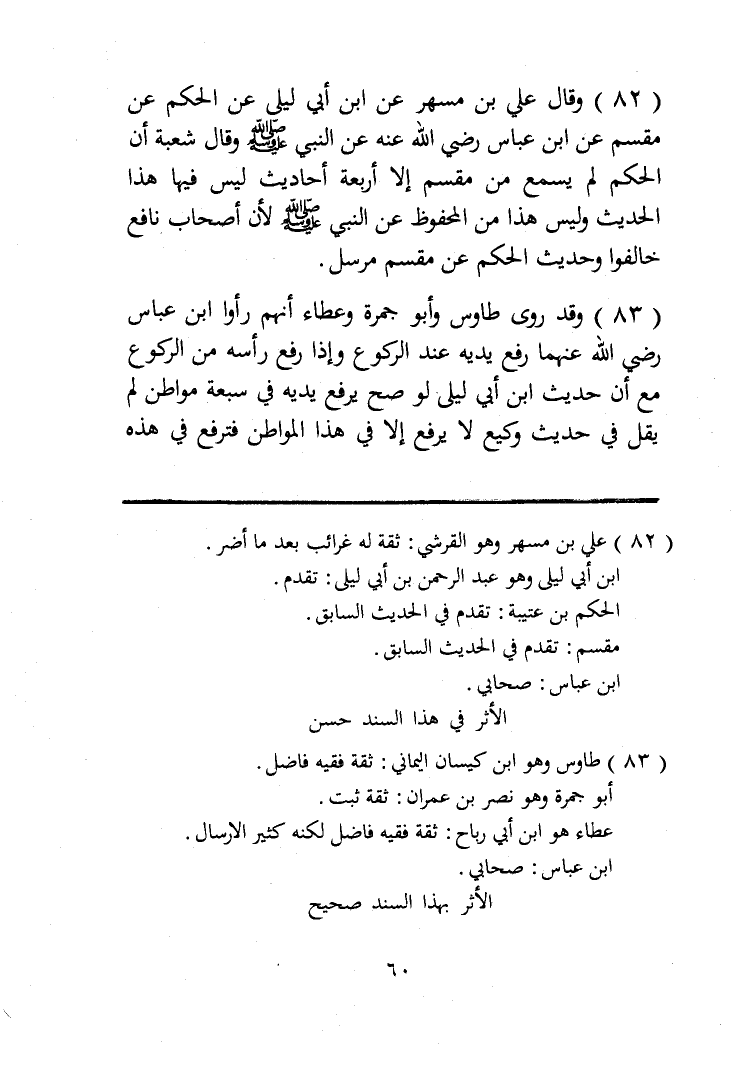 83 - وَقَدْ رَوَى طَاوُسٌ , وَأَبُو جَمْرَةَ وَعَطَاءٌ أَنَّهُمْ رَأَوُا ابْنَ عَبَّاسٍ «§رَفَعَ يَدَيْهِ عِنْدَ الرُّكُوعِ , وَإِذَا رَفَعَ رَأْسَهُ مِنَ الرُّكُوعِ» مَعَ أَنَّ حَدِيثَ ابْنَ أَبِي لَيْلَى لَوْ صَحَّ قَوْلُهُ تُرْفَعُ الْأَيْدِي فِي سَبْعَةِ مَوَاطِنَ لَمْ يَقُلْ فِي حَدِيثِ وَكِيعٍ لَا تُرْفَعُ إِلَّا فِي هَذِهِ الْمَوَاطِنِ.
