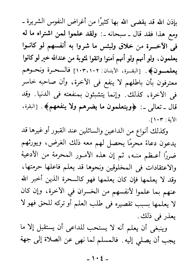 وكذلك أنواع من الداعين والسائلين عند القبور أو غيرها قد يدعون دعاءً محرَّمًا يحصل لهم معه ذلك الغرض، ويورثهم ضررًا أعظم منه، ثم إن هذه الأمور المحرمة من الأدعية والاعتقادات في المخلوقين ونحوها قد يعلم فاعلها حرمتها وقد لا يعلمها؛ فإن كان يعلمها فهو كالسحرة الذين أخبر الله عنهم بما عملوا لأنفسهم من الخسران في الآخرة، وإن كان لا يعلمها بسبب تقصيره في طلب العلم أو تركه للحق فهو لا يعذر في ذلك.