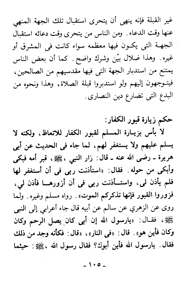غير القبلة فإنه ينهى أن يتحرى استقبال تلك الجهة المنهي عنها وقت الدعاء، ومن الناس من يتحرَّى وقت دعائه استقبال الجهة التي يكون فيها معظمه؛ سواء كانت في المشرق أو غيره؛ وهذا ضلال بيِّن وشرك واضح؛ كما أن بعض الناس يمتنع من استدبار الجهة التي فيها مقدسوهم من الصالحين، فيتوجهون إليهم ولو استدبروا قبلة الصلاة، وهذا ونحوه من البدع التي تضارع دين النصارى.