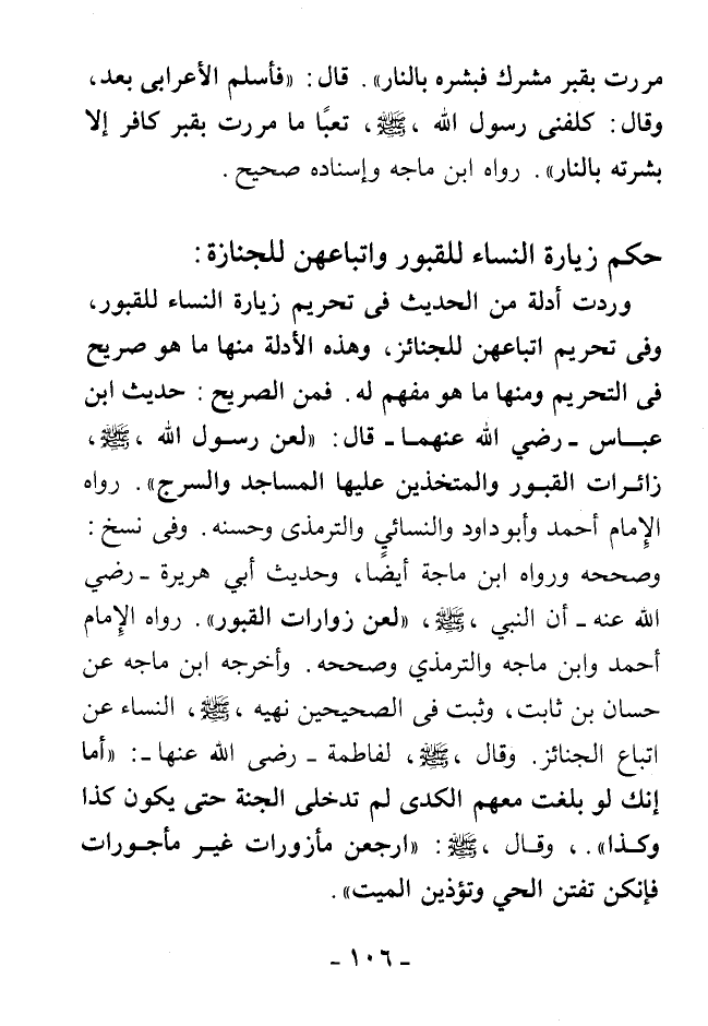 وفي نسخ: وصححه ورواه ابن ماجه أيضا، وحديث أبي هريرة - رضي الله عنه - أن النبي - صلى الله عليه وسلم - «لعن زوَّارات القبور». رواه الإمام أحمد وابن ماجه والترمذي وصححه، وأخرجه ابن ماجه عن حسان بن ثابت، وثبت في الصحيحين نهيه - صلى الله عليه وسلم - النساء عن اتباع الجنائز، وقال - صلى الله عليه وسلم - لفاطمة - رضي الله عنها: «أما إنك لو بلغت معهم الكدى لم تدخلي الجنة حتى يكون كذا وكذا». وقال - صلى الله عليه وسلم -: «ارجعن مأزورات غير مأجورات فإنكن تفتنَّ الحي وتؤذين الميت».