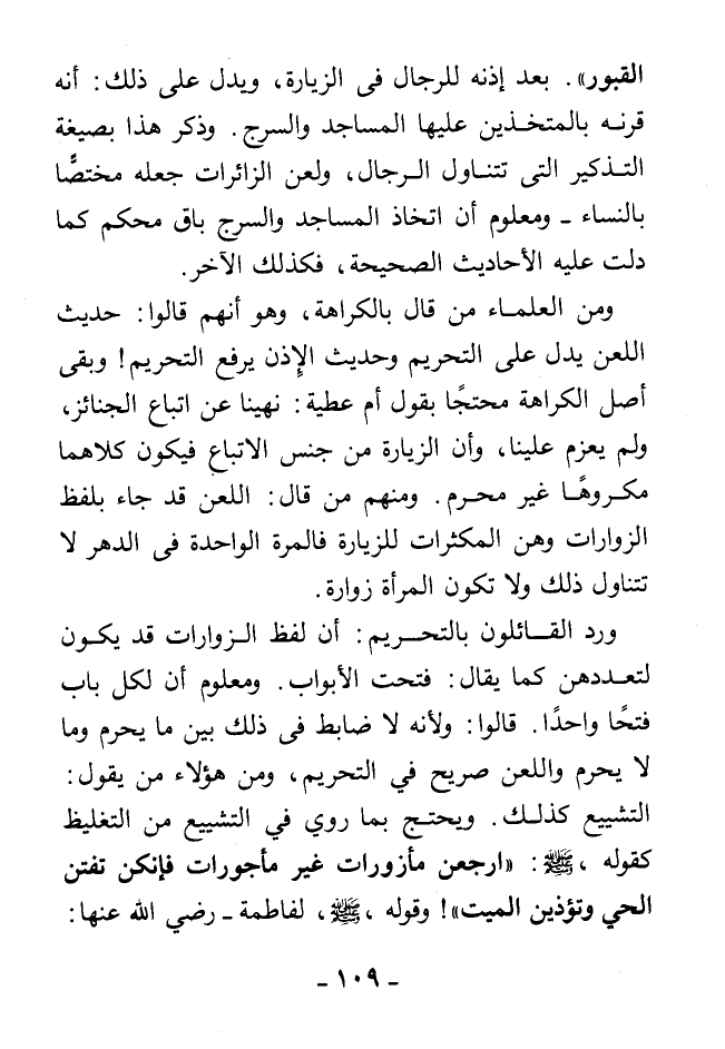 ورد القائلون بالتحريم: أن لفظ الزوارات قد يكون لتعددهن؛ كما يقال: فتحت الأبواب. ومعلوم أن لكل باب فتحًا واحدًا، قالوا: ولأنه لا ضابط في ذلك بين ما يحرم وما لا يحرم واللعن صريح في التحريم، ومن هؤلاء من يقول: التشييع كذلك، ويحتج بما روي في التشييع من التغليظ؛ كقوله - صلى الله عليه وسلم -: «ارجعن مأزورات غير مأجورات فإنكن تفتن الحي وتؤذين الميت». وقوله - صلى الله عليه وسلم - لفاطمة -رضي الله عنها: