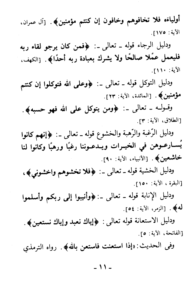 ودليل الرغبة والرهبة والخشوع قوله - تعالى-: {إِنَّهُمْ كَانُوا يُسَارِعُونَ فِي الْخَيْرَاتِ وَيَدْعُونَنَا رَغَبًا وَرَهَبًا وَكَانُوا لَنَا خَاشِعِينَ} [الأنبياء الآية: 90]. ودليل الخشية قوله تعالى: {فَلَا تَخْشَوْهُمْ وَاخْشَوْنِي} [البقرة الآية: 150].