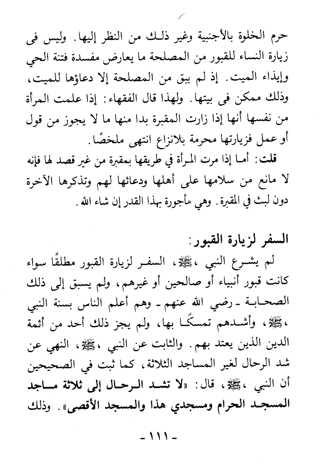 قلت: أما إذا مرت المرأة في طريقها بمقبرة من غير قصد لها فإنه لا مانع من سلامها على أهلها ودعائها لهم وتذكرها الآخرة دون لبث في المقبرة. وهي مأجورة بهذا القدر إن شاء الله.