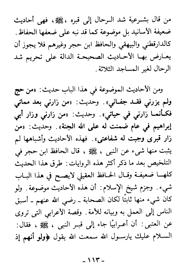 ومن الأحاديث الموضوعة في هذا الباب حديث: «من حج ولم يزرني فقد جفاني». وحديث: «من زارني بعد مماتي فكأنما زارني في حياتي». وحديث: «من زارني وزار أبي إبراهيم في عام ضمنت له على الله الجنة». وحديث: «من زار قبري وجبت له شفاعتي». فهذه الأحاديث وأشباهها لم يثبت منها شيء عن النبي - صلى الله عليه وسلم -؛ قال الحافظ ابن حجر في التلخيص بعد ما ذكر أكثر هذه الروايات: طرق هذا الحديث كلها ضعيفة، وقال الحافظ العقيلي: لا يصح في هذا الباب شيء. وجزم شيخ الإسلام: أن هذه الأحاديث موضوعة، ولو كان شيء منها ثابتًا لكان الصحابة - رضي الله عنهم - أسبق الناس إلى العمل به وبيانه للأمة.
