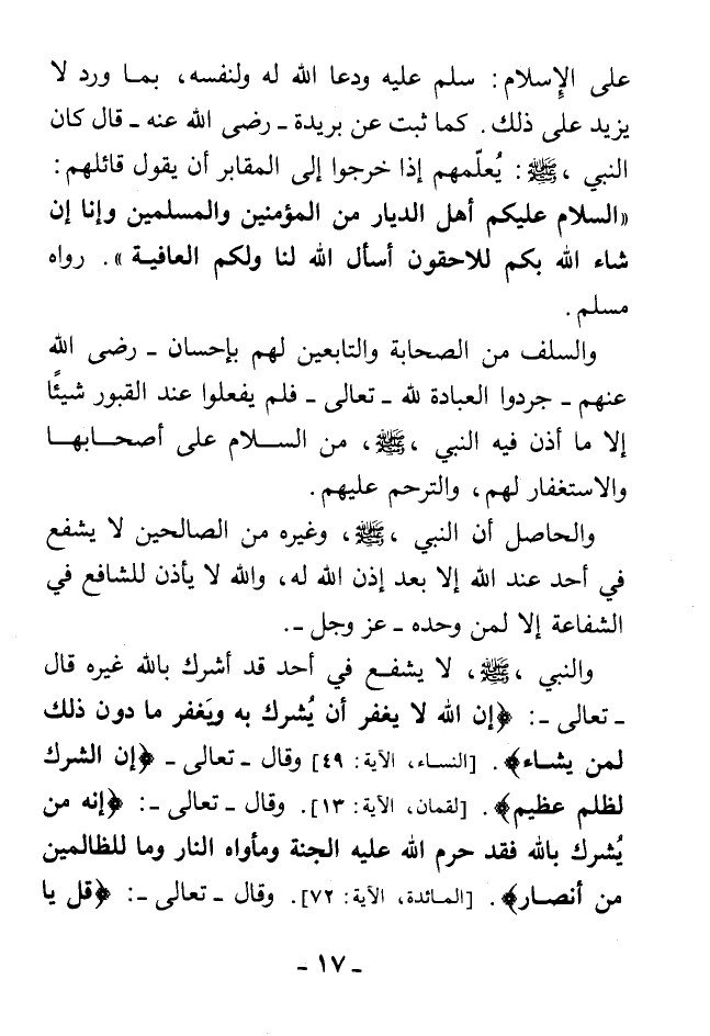 والسلف من الصحابة والتابعين لهم بإحسان - رضي الله عنهم - جردوا العبادة لله تعالى - فلم يفعلوا عند القبور شيئًا إلا ما أذن فيه النبي - صلى الله عليه وسلم - من السلام على أصحابها والاستغفار لهم، والترحم عليهم.