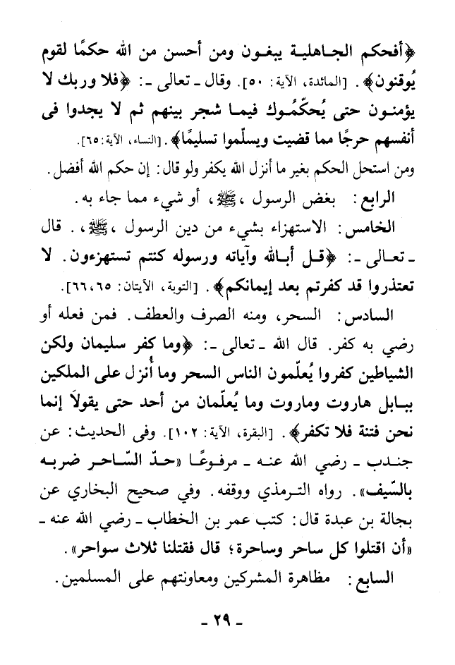 السادس: السحر، ومنه الصرف والعطف فمن فعله أو رضي به كفر. قال الله - تعالى -: {وَمَا كَفَرَ سُلَيْمَانُ وَلَكِنَّ الشَّيَاطِينَ كَفَرُوا يُعَلِّمُونَ النَّاسَ السِّحْرَ وَمَا أُنْزِلَ عَلَى الْمَلَكَيْنِ بِبَابِلَ هَارُوتَ وَمَارُوتَ وَمَا يُعَلِّمَانِ مِنْ أَحَدٍ حَتَّى يَقُولَا إِنَّمَا نَحْنُ فِتْنَةٌ فَلَا تَكْفُرْ} [البقرة: 102] وفي الحديث: عن جندب - رضي الله عنه - مرفوعا «حد الساحر ضربه بالسيف» رواه الترمذي ووقفه، وفي صحيح البخاري عن بجالة بن عبدة قال: كتب عمر بن الخطاب - رضي الله عنه - «أن اقتلوا كل ساحر وساحرة، قال فقتلنا ثلاث سواحر».