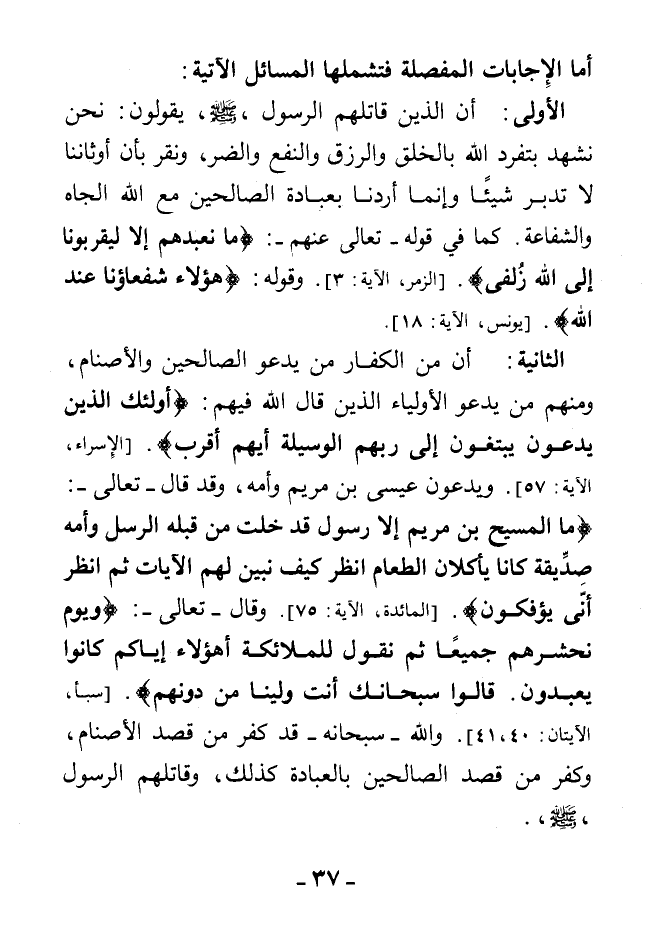 الأولى: أن الذين قاتلهم الرسول، - صلى الله عليه وسلم - يقولون: نحن نشهد بتفرد الله بالخلق والرزق والنفع والضر، ونقر بأن أوثاننا لا تدبر شيئًا وإنما أردنا بعبادة الصالحين مع الله الجاه والشفاعة. كما في قوله تعالى عنهم: {مَا نَعْبُدُهُمْ إِلَّا لِيُقَرِّبُونَا إِلَى اللَّهِ زُلْفَى} [الزمر، الآية:3] وقوله: {هَؤُلَاءِ شُفَعَاؤُنَا عِنْدَ اللَّهِ} [يونس، الآية: 18].