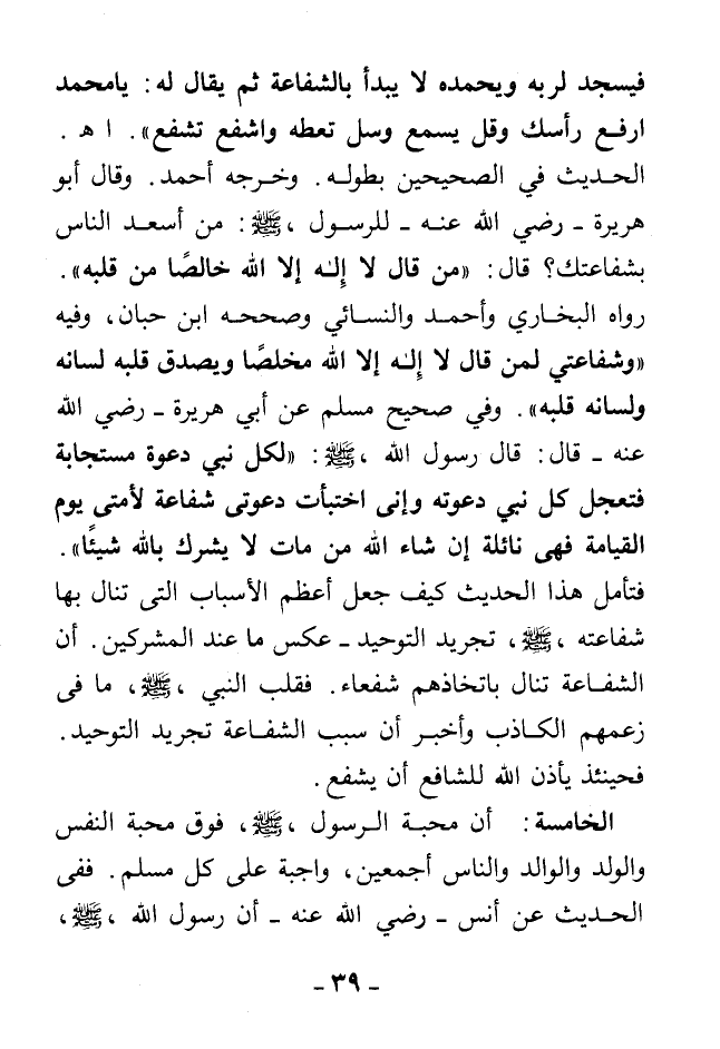 فتأمل هذا الحديث كيف جعل أعظم الأسباب التي تنال بها شفاعته، - صلى الله عليه وسلم - تجريد التوحيد - عكس ما عند المشركين أن الشفاعة تنال باتخاذهم شفعاء فقلب النبي - صلى الله عليه وسلم - ما في زعمهم الكاذب وأخبر أن سبب الشفاعة تجريد التوحيد فحيئنذ يأذن الله للشافع أن يشفع.
