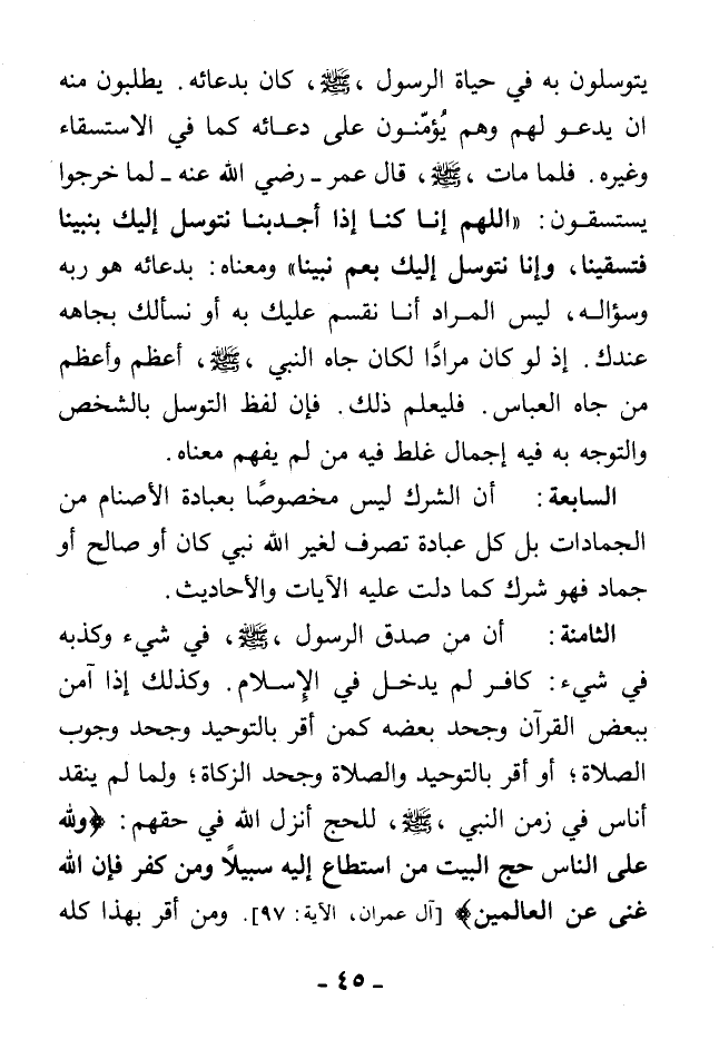 يتوسلون به في حياة الرسول - صلى الله عليه وسلم -، كان بدعائه. يطلبون منه أن يدعو لهم وهم يؤمنون على دعائه كما في الاستسقاء وغيره. فلما مات - صلى الله عليه وسلم - قال عمر - رضي الله عنه - لما خرجوا يستسقون: «اللهم إنا كنا إذا أجدبنا نتوسل إليك بنبينا فتسقينا، وإنا نتوسل إليك بعم نبينا» ومعناه: بدعائه هو ربه وسؤاله، ليس المراد أنا نقسم عليك به أو نسألك بجاهه عندك. إذ لو كان مرادًا لكان جاه النبي - صلى الله عليه وسلم - أعظم وأعظم من جاه العباس فليعلم ذلك. فإن لفظ التوسل بالشخص والتوجيه به فيه إجمال غلط فيه من لم يفهم معناه.