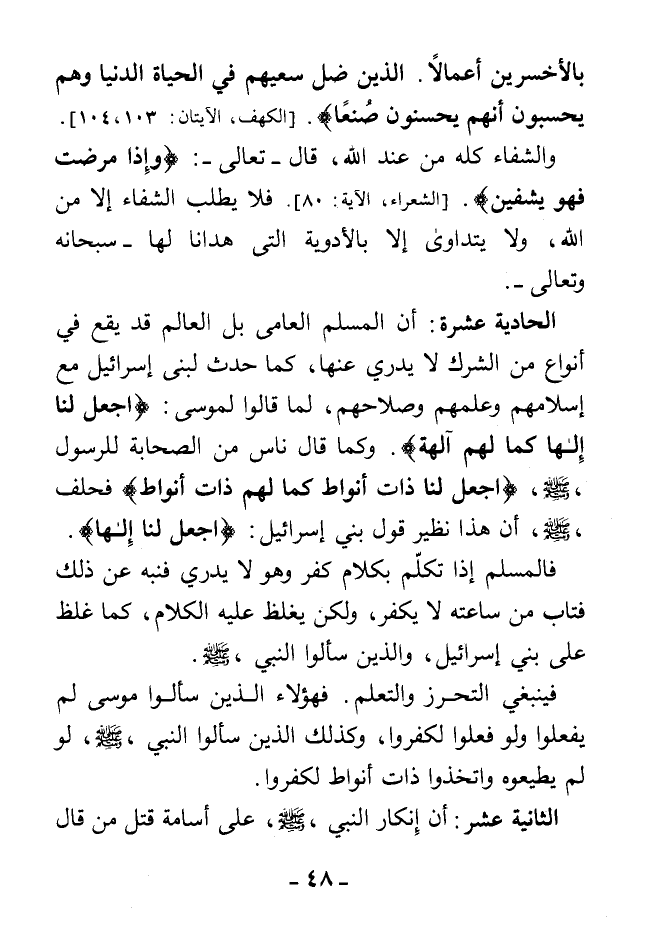 الحادية عشرة: أن المسلم العامي بل العالم قد يقع في أنواع من الشرك لا يدري عنها، كما حدث لبني إسرائيل مع إسلامهم وعلمهم وصلاحهم، لما قالوا لموسى: {اجْعَلْ لَنَا إِلَهًا كَمَا لَهُمْ آَلِهَةٌ} وكما قال ناس من الصحابة للرسول - صلى الله عليه وسلم -: «اجعل لنا ذات أنواط كما لهم ذات أنواط» فحلف - صلى الله عليه وسلم -، أن هذا نظير قول بني إسرائيل: {اجْعَلْ لَنَا إِلَهًا}.