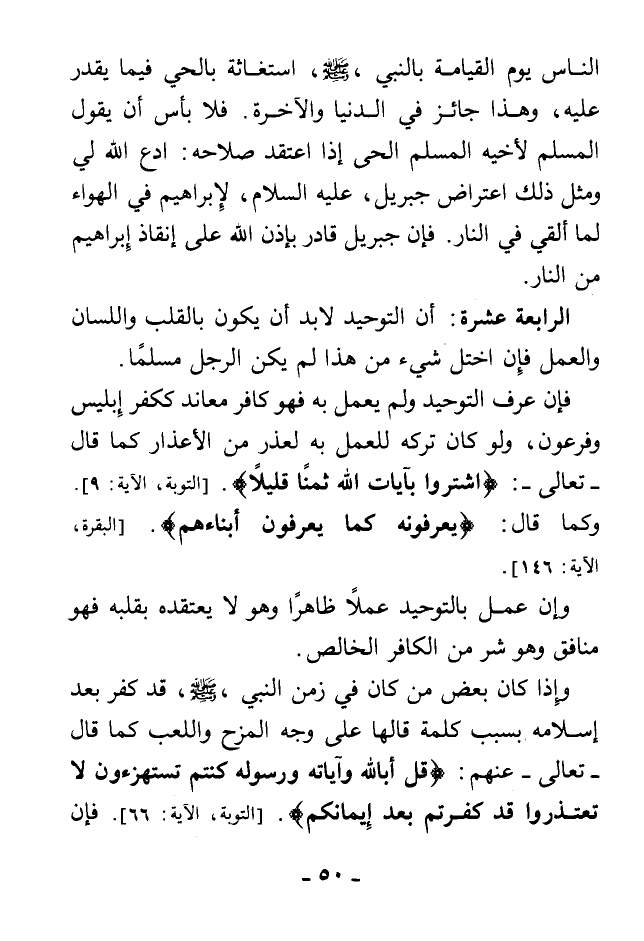 الرابعة عشرة: أن التوحيد لا بد أن يكون بالقلب واللسان والعمل فإن اختل شيء من هذا لم يكن الرجل مسلمًا.