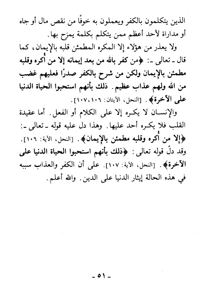 ولا يعذر من هؤلاء إلا المكره المطمئن قلبه بالإيمان، كما قال - تعالى: {مَنْ كَفَرَ بِاللَّهِ مِنْ بَعْدِ إِيمَانِهِ إِلَّا مَنْ أُكْرِهَ وَقَلْبُهُ مُطْمَئِنٌّ بِالْإِيمَانِ وَلَكِنْ مَنْ شَرَحَ بِالْكُفْرِ صَدْرًا فَعَلَيْهِمْ غَضَبٌ مِنَ اللَّهِ وَلَهُمْ عَذَابٌ عَظِيمٌ * ذَلِكَ بِأَنَّهُمُ اسْتَحَبُّوا الْحَيَاةَ الدُّنْيَا عَلَى الْآَخِرَةِ} [النحل، الآيتان: 106، 107].