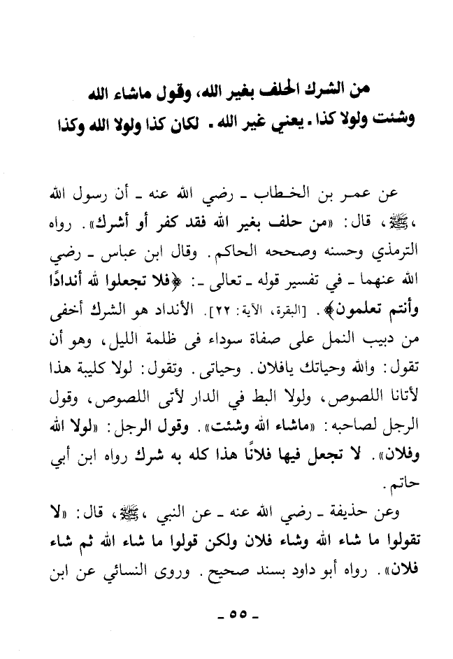 عن عمر بن الخطاب - رضي الله عنه - أن رسول الله - صلى الله عليه وسلم - ... قال: «من حلف بغير الله فقد كفر أو أشرك» رواه الترمذي وحسنه وصححه الحاكم وقال ابن عباس - رضي الله عنهما - في تفسير قوله - تعالى - {فَلَا تَجْعَلُوا لِلَّهِ أَنْدَادًا وَأَنْتُمْ تَعْلَمُونَ} [البقرة، الآية: 22] الأنداد هو الشرك أخفى من دبيب النمل على صفاة سوداء في ظلمة الليل، وهو أن تقول: والله وحياتك يا فلان. وحياتي. وتقول: لولا كليبة هذا لأتانا اللصوص، ولولا البط في الدار لأتى اللصوص، وقول الرجل لصاحبه: «ما شاء الله وشئت». وقول الرجل: «لولا الله وفلان» لا تجعل فيها فلانًا هذا كله به شرك رواه ابن أبي حاتم.