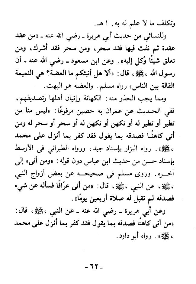 وللنسائي من حديث أبي هريرة - رضي الله عنه - «من عقد عقدة ثم نفث فيها فقد سحر، ومن سحر فقط أشرك، ومن تعلق شيئًا وكل إليه» وعن ابن مسعود - رضي الله عنه - أن رسول الله، - صلى الله عليه وسلم - قال: «ألا هل أنبئكم ما العضة؟ هي النميمة القالة بين الناس» رواه مسلم. والعضه هو البهت.