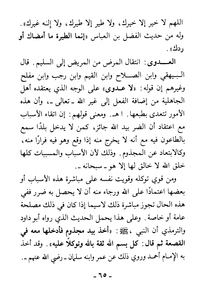 ومن قوي توكله وقويت نفسه على مباشرة هذه الأسباب أو بعضها اعتمادًا على الله ورجاء منه أن لا يحصل به ضرر ففي هذه الحال تجوز مباشرة ذلك لا سيما إذا كان في ذلك مصلحة عامة أو خاصة. وعلى هذا يجعل الحديث الذي رواه أبو داود والترمذي أن النبي - صلى الله عليه وسلم -: «أخذ بيد مجذوم فأدخلها معه في القصعة ثم قال: كل بسم الله ثقة بالله وتوكلا عليه» وقد أخذ به الإمام أحمد وروي ذلك عن عمر وابنه سلمان - رضي الله عنهم -
