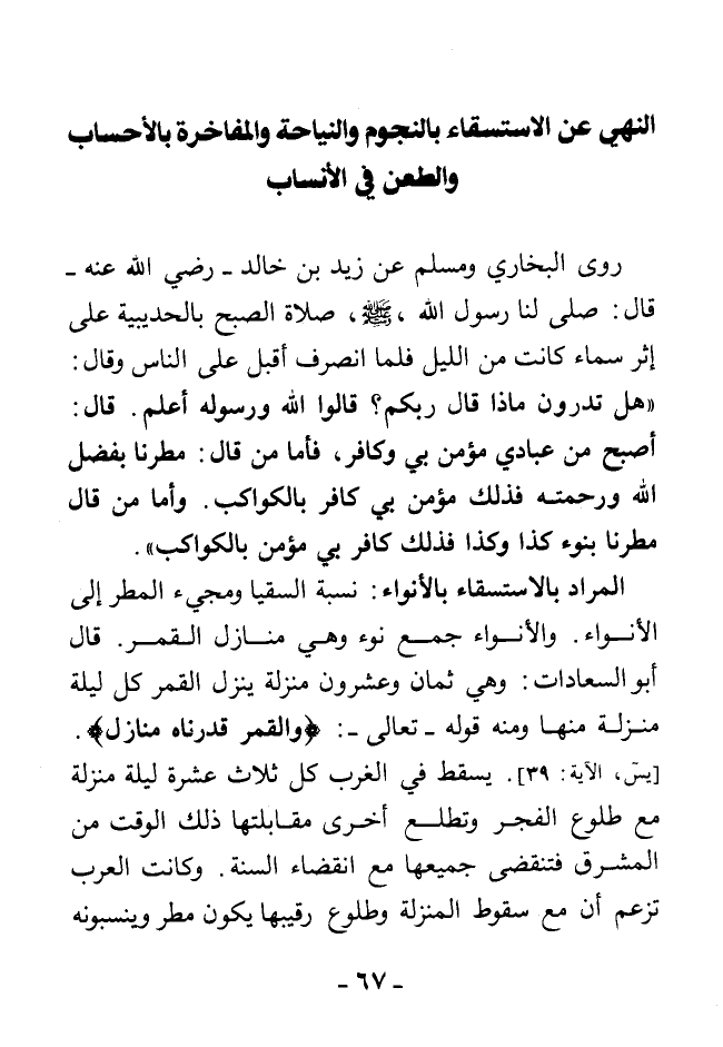 روى البخاري ومسلم عن زيد بن خالد - رضي الله عنه - قال: صلى لنا رسول الله - صلى الله عليه وسلم -، صلاة الصبح بالحديبية على إثر سماء كانت من الليل فلما انصرف أقبل على الناس وقال: «هل تدرون ماذا قال ربكم؟ قالوا الله ورسوله أعلم. قال: أصبح من عبادي مؤمن بي وكافر، فأما من قال: مطرنا بفضل الله ورحمته فذلك مؤمن بي وكافر بالكواكب. وأما من قال مطرنا بنوء كذا وكذا فذلك كافر بي مؤمن بالكواكب».