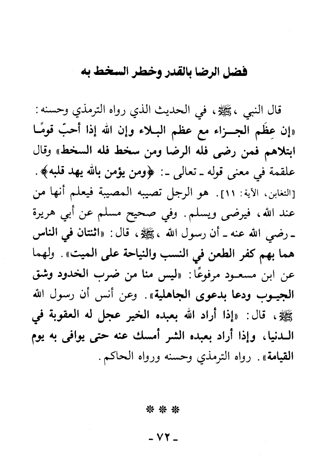 قال النبي - صلى الله عليه وسلم -، في الحديث الذي رواه الترمذي وحسنه: «إن عِظَم الجزاء مع عظم البلا وإن الله إذا أحب قومًا ابتلاهم فمن رضى فله الرضا ومن سخط فله السخط» وقال علقمة في معنى قوله - تعالى -: {وَمَنْ يُؤْمِنْ بِاللَّهِ يَهْدِ قَلْبَهُ} [التغابن، الآية: 11]. هو الرجل تصيبه المصيبة فيعلم أنها من عند الله، فيرضى ويسلم، وفي صحيح مسلم عن أبي هريرة - رضي الله عنه - أن رسول الله، - صلى الله عليه وسلم -، قال: «اثنتان في الناس هما بهم كفر الطعن في النسب والنياحة على الميت» ولهما عن ابن مسعود مرفوعًا: «ليس منا من ضرب الخدود وشق الجيوب ودعا بدعوى الجاهلية» وعن أنس أن رسول الله - صلى الله عليه وسلم -، قال: «إذا أراد الله بعبده الخير عجل له العقوبة في الدنيا، وإذا أراد بعبده الشر أمسك عنه حتى يوافى به يوم القيامة» رواه الترمذي وحسنه ورواه الحاكم.