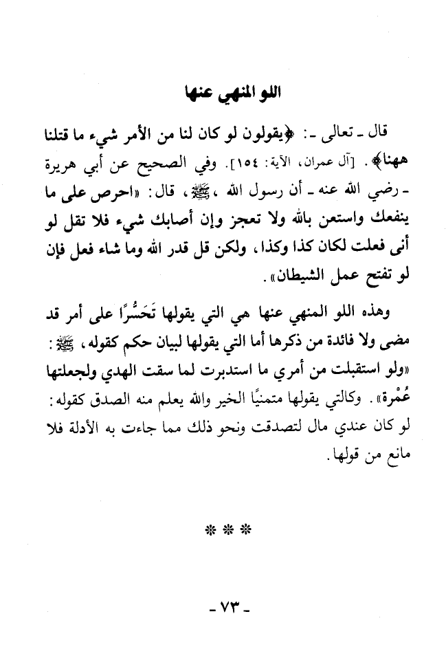 قال - تعالى -: {يَقُولُونَ لَوْ كَانَ لَنَا مِنَ الْأَمْرِ شَيْءٌ مَا قُتِلْنَا هَاهُنَا} [آل عمران، الآية: 154] وفي الصحيح عن أبي هريرة - رضي الله عنه - أن رسول الله - صلى الله عليه وسلم - قال: «احرص على ما ينفعك واستعن بالله ولا تعجز وإن أصابك شيء فلا تقل لو أني فعلت لكان كذا وكذا، ولكن قل قدر الله وما شاء فعل فإن لو تفتح عمل الشيطان».