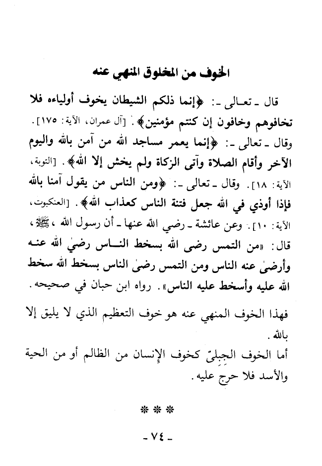 وعن عائشة رضي الله عنها - أن رسول الله، - صلى الله عليه وسلم -، قال: «من التمس رضى الله بسخط الناس رضي الله عنه وأرضى عنه الناس ومن التمس رضى الناس بسخط الله سخط الله عليه وأسخط الناس عليه» رواه ابن حبان في صحيحه. فهذا الخوف المنهي عنه هو خوف التعظيم الذي لا يليق إلا بالله.