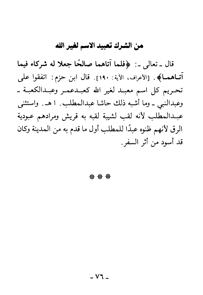 قال - تعالى -: {فَلَمَّا آَتَاهُمَا صَالِحًا جَعَلَا لَهُ شُرَكَاءَ فِيمَا آَتَاهُمَا} [الأعراف، الآية190] قال ابن حزم: اتفقوا على تحريم كل اسم معبد لغير الله كعبد عمر وعبد الكعبة - وعبد النبي - وما أشبه ذلك حاشا عبد المطلب. اهـ. واستثنى عبد المطلب لأنه لقب لشيبة لقبه به قريش ومرادهم عبودية الرق لأنهم ظنوه عبدًا للمطلب أول ما قدم به من المدينة وكان قد أسود من أثر السفر.