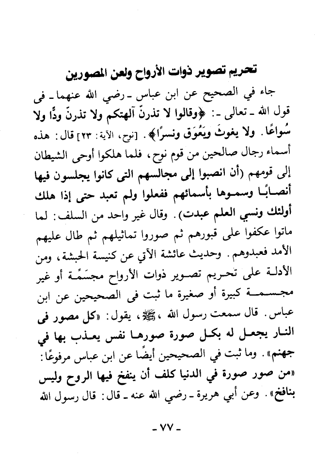 جاء في الصحيح عن ابن عباس - رضي الله عنهما - في قول الله - تعالى -: {وَقَالُوا لَا تَذَرُنَّ آَلِهَتَكُمْ وَلَا تَذَرُنَّ وَدًّا وَلَا سُوَاعًا وَلَا يَغُوثَ وَيَعُوقَ وَنَسْرًا} [نوح، الآية: 23] قال: هذه أسماء رجال صالحين من قوم نوح، فلما هلكوا أوحى الشيطان إلى قومهم (أن انصبوا إلى مجالسهم التي كانوا يجلسون فيها أنصابًا وسموها بأسمائهم ففعلوا ولم تعبد حتى إذا هلك أولئك ونسي العلم عبدت) وقال غير واحد من السلف: لما ماتوا عكفوا على قبورهم ثم صوروا تماثيلهم ثم طال عليهم الأمد فعبدوهم. وحديث عائشة الآتي عن كنيسة الحبشة، ومن الأدلة على تحريم تصوير ذوات الأرواح مجسمة أو غير مجسمة كبيرة أو صغيرة ما ثبت في الصحيحين عن ابن عباس. قال سمعت رسول الله - صلى الله عليه وسلم -، يقول: «كل مصور في النار يجعل له بكل صورة صورها نفس يعذب بها في جهنم» وما ثبت في الصحيحين أيضًا عن ابن عباس مرفوعًا: «من صور صورة في الدنيا كلف أن ينفخ فيها الروح وليس بنافخ» وعن أبي هريرة - رضي الله عنه - قال: قال رسول الله