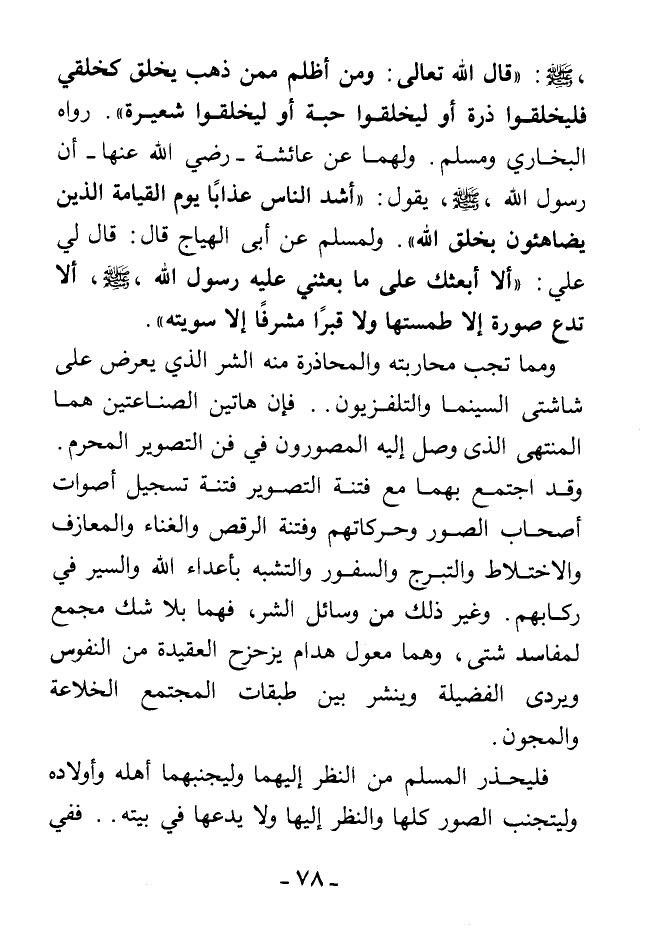 - صلى الله عليه وسلم -: «قال الله تعالى: ومن أظلم ممن ذهب يخلق كخلقي فليخلقوا ذرة أو ليخلقوا حبة أو ليخلقوا شعيرة» رواه البخاري ومسلم. ولهما عن عائشة رضي الله عنها - أن البخاري ومسلم. ولهما عن عائشة - رضي الله عنها - أن رسول الله - صلى الله عليه وسلم -، يقول: «أشد الناس عذابًا يوم القيامة الذين يضاهئون بخلق الله» ولمسلم عن أبي الهياج قال: قال لي علي: «ألا أبعثك على ما بعثني عليه رسول الله - صلى الله عليه وسلم -، ألا تدع صورة إلا طمستها ولا قبرًا مشرفًا إلا سويته».