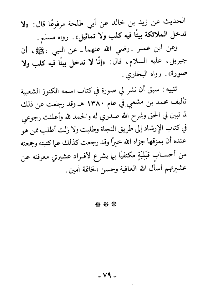 تنبيه: سبق أن نشر لي صورة في كتاب اسمه الكنوز الشعبية تأليف محمد بن مشعي في عام 1380 هـ وقد رجعت عن ذلك لما تبين لي الحق وشرح الله صدري له والحمد لله وأعلنت رجوعي في كتاب الإرشاد إلى طريق النجاة وطلبت ولا زلت أطلب ممن هو عنده أن يمزقها جزاه الله خيرًا وقد رجعت كذلك عما كتبته وجمعته من أحساب قبلية مكتفيًا بما يشرع لأفراد عشيرتي معرفته عن عشيرتهم أسأل الله العافية وحسن الخاتمة آمين.
