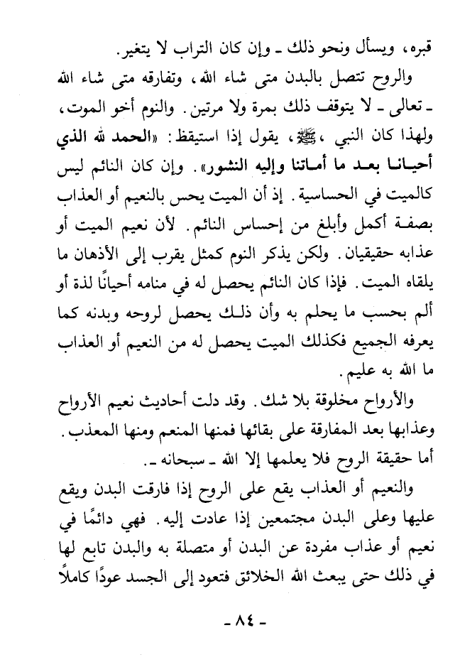 والنوم أخو الموت؛ ولهذا كان النبي - صلى الله عليه وسلم - يقول إذا استيقظ: «الحمد لله الذي أحيانا بعدما أماتنا وإليه النشور». وإن كان النائم ليس كالميت في الحساسية؛ إذ إن الميت يحس بالنعيم أو العذاب بصفة أكمل وأبلغ من إحساس النائم؛ لأن نعيم الميت أو عذابه حقيقيان؛ ولكن يُذكر النوم كمثلٍ يقرِّب إلى الأذهان ما يلقاه الميت؛ فإذا كان النائم يحصل له في منامه أحيانًا لذة أو ألم بحسب ما يحلم به وأن ذلك يحصل لروحه وبدنه كما يعرفه الجميع، فكذلك الميت يحصل له من النعيم أو العذاب ما الله به عليم.