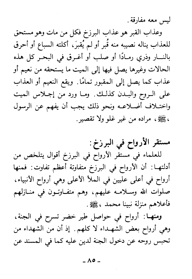 ومنها: أرواح في حواصل طير خضر تسرح في الجنة وهي أرواح بعض الشهداء لا كلهم؛ إذ إن من الشهداء من تُحبس روحه عن دخول الجنة لدَين عليه؛ كما في المسند عن