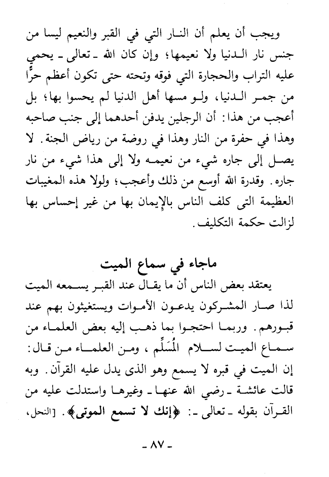 وبجب أن يعلم أن النار التي في القبر والنعيم ليسا من جنس نار الدنيا ولا نعيمها؛ وإن كان الله تعالى يحمي عليه التراب والحجارة التي فوقه وتحته حتى تكون أعظم حرا من جمر الدنيا، ولو مسها أهل الدنيا لم يحسوا بها؛ بل أعجب من هذا: أن الرَّجلين يدفن أحدهما إلى جنب صاحبه وهذا في حفرة من النار وهذا في روضة من رياض الجنة، لا يصل إلى جاره شيء من نعيمه ولا إلى هذا شيء من نار جاره، وقدرة الله أوسع من ذلك وأعجب؛ ولولا هذه المغيبات العظيمة التي كلف الناس بالإيمان بها من غير إحساس بها لزالت حكمة التكليف.