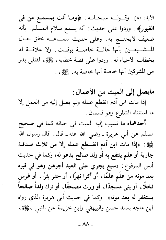 الآية 80]، وقوله سبحانه: {وَمَا أَنْتَ بِمُسْمِعٍ مَنْ فِي الْقُبُورِ}، وردوا على حديث أنه يسمع سلام المسلم بأنه ضعيف لا يحتجُّ به، وعلى حديث سماعه خفق نعال المشيعين بأنها حالة خاصة بوقت، ولا علاقة له بخطاب الأحياء له. وردوا على قصة خطابه صلى الله عليه وسلم لقتلى بدر من المشركين أنها خاصة به - صلى الله عليه وسلم -.