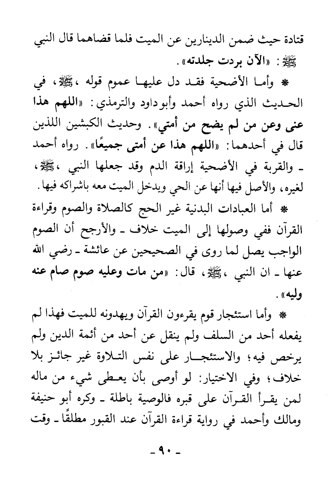 *وأما الأضحية فقد دل عليها عموم قوله - صلى الله عليه وسلم - في الحديث الذي رواه أحمد وأبو داود والترمذي: «اللهم هذا عني وعن من لم يُضَحِّ من أمتي». وحديث الكبشين اللذين قال في أحدهما: «اللهم هذا عن أمتي جميعا». رواه أحمد. والقربة في الأضحية إراقة الدم، وقد جعلها النبي - صلى الله عليه وسلم - لغيره، والأصل فيها أنها عن الحي، ويدخل الميت معه بإشراكه فيها.