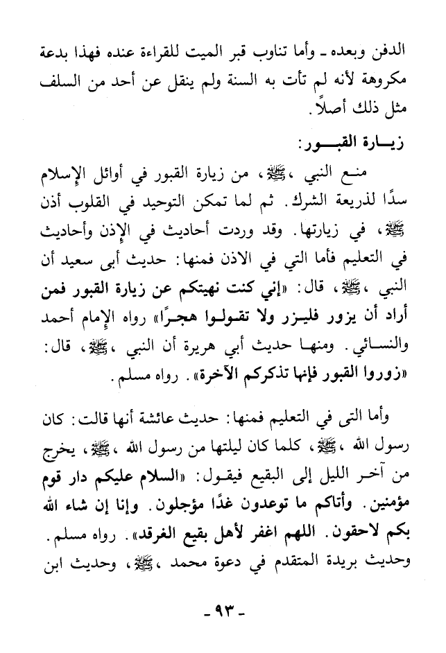 وأما التي في التعليم فمنها: حديث عائشة أنها قالت: كان رسول الله - صلى الله عليه وسلم - كلما كان ليلتها من رسول الله - صلى الله عليه وسلم - يخرج من آخر الليل إلى البقيع فيقول: «السلام عليكم دار قوم مؤمنين، وأتاكم ما توعدون غدا مؤجلون، وإنا إن شاء الله بكم لاحقون، اللهم اغفر لأهل بقيع الغرقد». رواه مسلم.