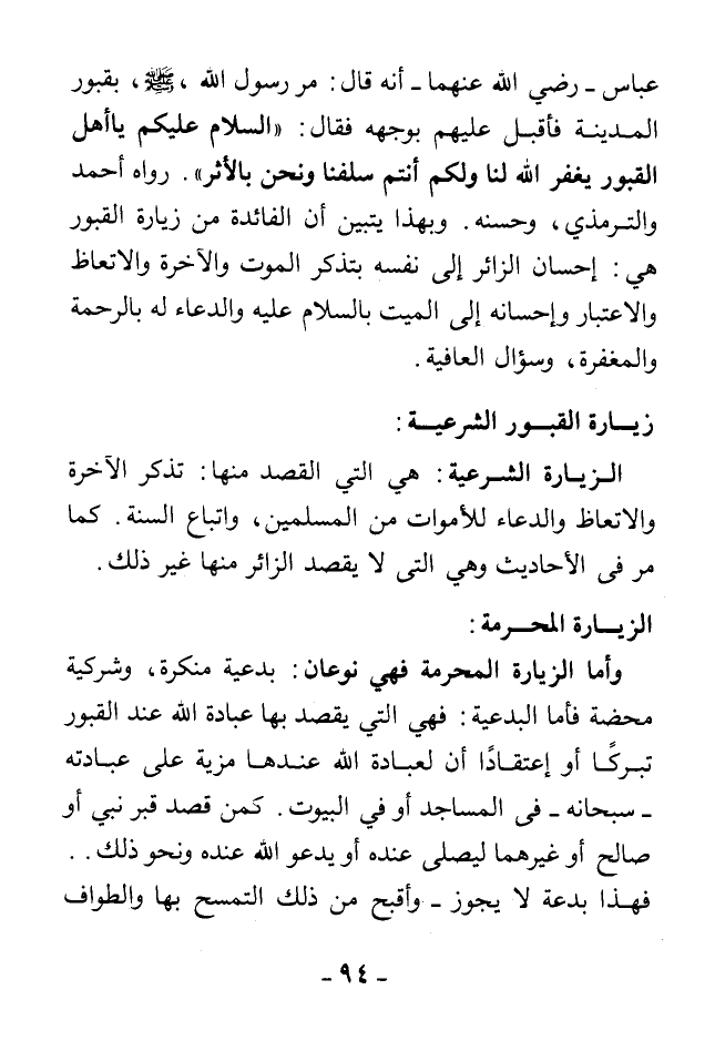 عباس رضي الله عنهما أنه قال: مر رسول الله - صلى الله عليه وسلم - بقبور المدينة فأقبل عليهم بوجهه فقال: «السلام عليكم يا أهل القبور يغفر الله لنا ولكم أنتم سلفنا ونحن بالأثر». رواه أحمد والترمذي وحسَّنه. وبهذا يتبين أن الفائدة من زيارة القبور هي: إحسان الزائر إلى نفسه بتذكر الموت والآخرة والاتعاظ والاعتبار، وإحسانه إلى الميت بالسلام عليه والدعاء له بالرحمة والمغفرة وسؤال العافية.