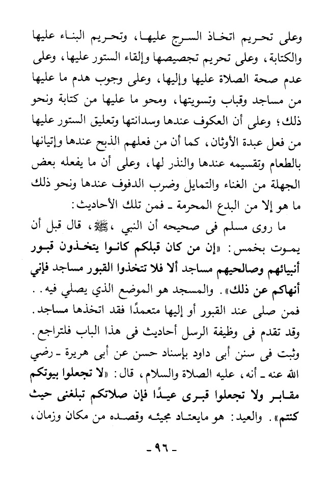 ما روى مسلم في صحيحه أن النبي - صلى الله عليه وسلم - قال قبل أن يموت بخمس: «إن من كان قبلكم كانوا يتخذون قبور أنبيائهم وصالحيهم مساجد ألا فلا تتخذوا القبور مساجد فإني أنهاكم عن ذلك». والمسجد هو الموضع الذي يصلي فيه .. فمن صلى عند القبور أو إليها متعمدا فقد اتخذها مساجد. وقد تقدم في وظيفة الرسل أحاديث في هذا الباب فلتراجع.