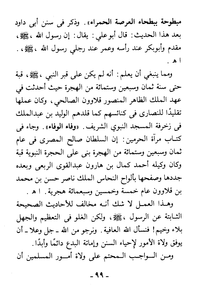 ومما ينبغي أن يعلم: أنه لم يكن على قبر النبي - صلى الله عليه وسلم - قبة حتى سنة ثمان وسبعين وستمائة من الهجرة؛ حيث أحدثت في عهد الملك الظاهر المنصور قلاوون الصالحي، وكان عملها تقليداً للنصارى في كنائسهم كما قلدهم الوليد بن عبد الملك في زخرفة المسجد النبوي الشريف. «وفاء الوفاء»، وجاء في كتاب مرآة الحرمين: إن السلطان صالح المصري في عام ثمان وسبعين وستمائة من الهجرة بنى على الحجرة النبوية قبة، وكان وكيله أحمد كمال بن هارون عبد القوي الربعي، وبعده جددها وصفحها بألواح النحاس الملك ناصر حسن بن محمد بن قلاوون عام خمسة وخمسين وسبعمائة هجرية. أ. هـ