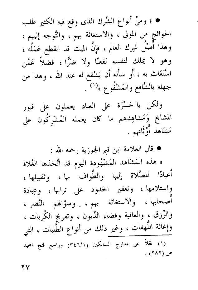 "هذه المَشَاهد المَشْهُودة اليوم قد اتَّخذها الغُلاة أعيادًا للصَّلاة إليها والطَّواف بها، وتَقبيلها، واستلامها، وتعفير الخدود على ترابها، وعِبادة أصحابها، والاستغاثة بهم، وسؤالهم النَّصر، والرِّزق، والعافية وقضاء الدِّيون، وتفريج الكُربات، وإغاثة اللَّهفات، وغير ذلك من أنواع الطَّلبات، التي