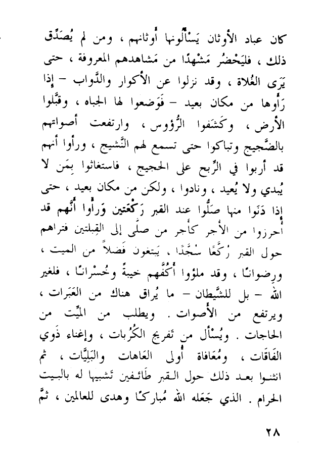 كان عباد الأوثان يَسْأَلُونها أوثانهم، ومن لم يُصَدِّق ذلك، فليَحْضُر مَشْهدًا من مَشاهدهم المعروفة، حتى يَرَى الغُلاة، وقد نزلوا عن الأكوار والدَّواب - إذا رَأَوها من مكان بعيد- فَوَضعوا لها الجباه، وقبَّلوا الأرض، وكَشَفوا الرُّؤوس، وارتفعت أصواتهم بالضَّجيج، وتباكوا حتى تسمع لهم النَّشيج، ورأوا أنهم قد أربوا في الرِّبح على الحجيج، فاستغاثوا بِمَن لا يُبدي ولا يُعيد، ونادوا، ولكن من مكان بعيد، حتى إذا دَنَوا منها صَلُّوا عند القبر رَكْعَتين، وَرأوا أَنَّهم قد أحرزوا من الأجر كأَجر من صلَّى إلى القبلتين، فتراهم حول القبر رُكَّعًا سُجَّدًا، يَبتغون فَضلا من الميت ورِضوانًا، وقد ملئوا أكُفَّهم خيبةً وخُسْرانًا، فلغير الله - بل للشَّيطان- ما يُراق هناك من العَبَرات، ويرتفع من الأصوات، ويطلب من الميِّت من الحاجات، ويُسْأل من تَفريج الكُرُبات، وإغناء ذَوي الفَاقَات، ومُعَافاة أُولي العَاهات والبَلِيَّات، ثم انثنوا بعد ذلك حول القبر طَائفين تَشبيهًا له بالبيت الحرام الذي جَعَله الله مُباركًا وهدى للعالمين، ثمَّ
