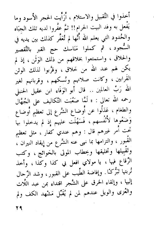 قال أبو الوفاء ابن عقيل الحنبلي رحمه الله تعالى: "لما صعبت التكاليف على الجهال والطغام، عدلوا عن أوضاع الشرع إلى تعظيم أوضاع وضعوها لأنفسهم، فسهلت عليهم؛ إذ لم يدخلوا بها تحت أمر غيرهم، قال: وهم عندي كفار، مثل تعظيم القبور، والتزامها بما نهى عنه الشرع من إيقاد النيران، وتقبيلها وتخليقها، وخطاب الموتى بالحوائج، وكتب الرقاع فيها، يا مولاي، افعل لي كذا وكذا، وأخذ تربتها تبركًا، وإفاضة الطيب على القبور، وشد الرحال إليها، وإلقاء الخرق على الشجر؛ اقتداء بمن عبد اللات والعزى، والويل عندهم لمن لم يقبل مشهد الكف، ولم
