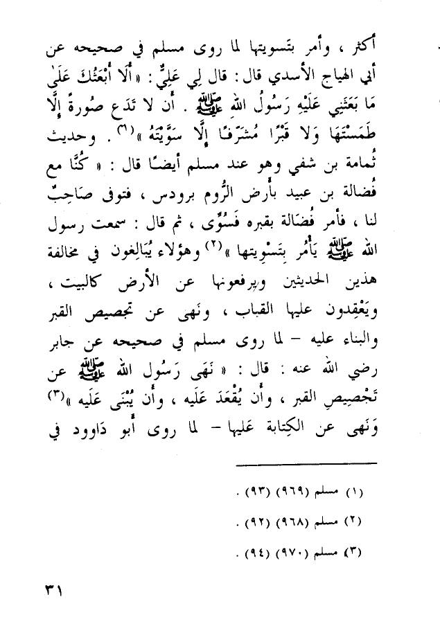 أكثر، وأمر بتَسويتها لما روى مسلم في صحيحه، عن أبي الهياج الأسدي قال: قال لِي عَلِيٌّ: " «أَلاَ أَبْعَثُكَ عَلَى مَا بَعَثَنِي عَلَيْهِ رَسُولُ اللهِ صلى الله عليه وسلم أن لا تَدَع صُورةً إلَّا طَمَسْتَهَا وَلا قَبْرًا مُشَرّفًا إلَّا سَوَّيْتَهُ» ". وحديث ثُمامة بن شفي، وهو عند مسلم أيضًا قال: " كُنَّا مع فُضالة بن عبيد بأرض الرُّوم برودس، فتوفي صَاحِبٌ لنا، فأمر فُضَالة بقبره فَسُوِّي، ثم قال: سمعت رسول الله صلى الله عليه وسلم يَأْمُر بِتَسْوِيتها"، وهؤلاء يُبَالِغون في مخالفة هذين الحديثين، ويرفعونها عن الأرض كالبيت، ويَعْقِدون عليها القباب، ونَهى عن تجصيص القبر والبناء عليه - لما روى مسلم في صحيحه، عن جابر رضي الله عنه، قال: «نَهَى رَسُول الله صلى الله عليه وسلم عن تَجْصِيصِ القبر، وأن يُقْعَدَ عَلَيه، وأَن يُبْنَى عليه» ، وَنَهى عن الكِتابة عَليها - لما روى أبو دَاود في